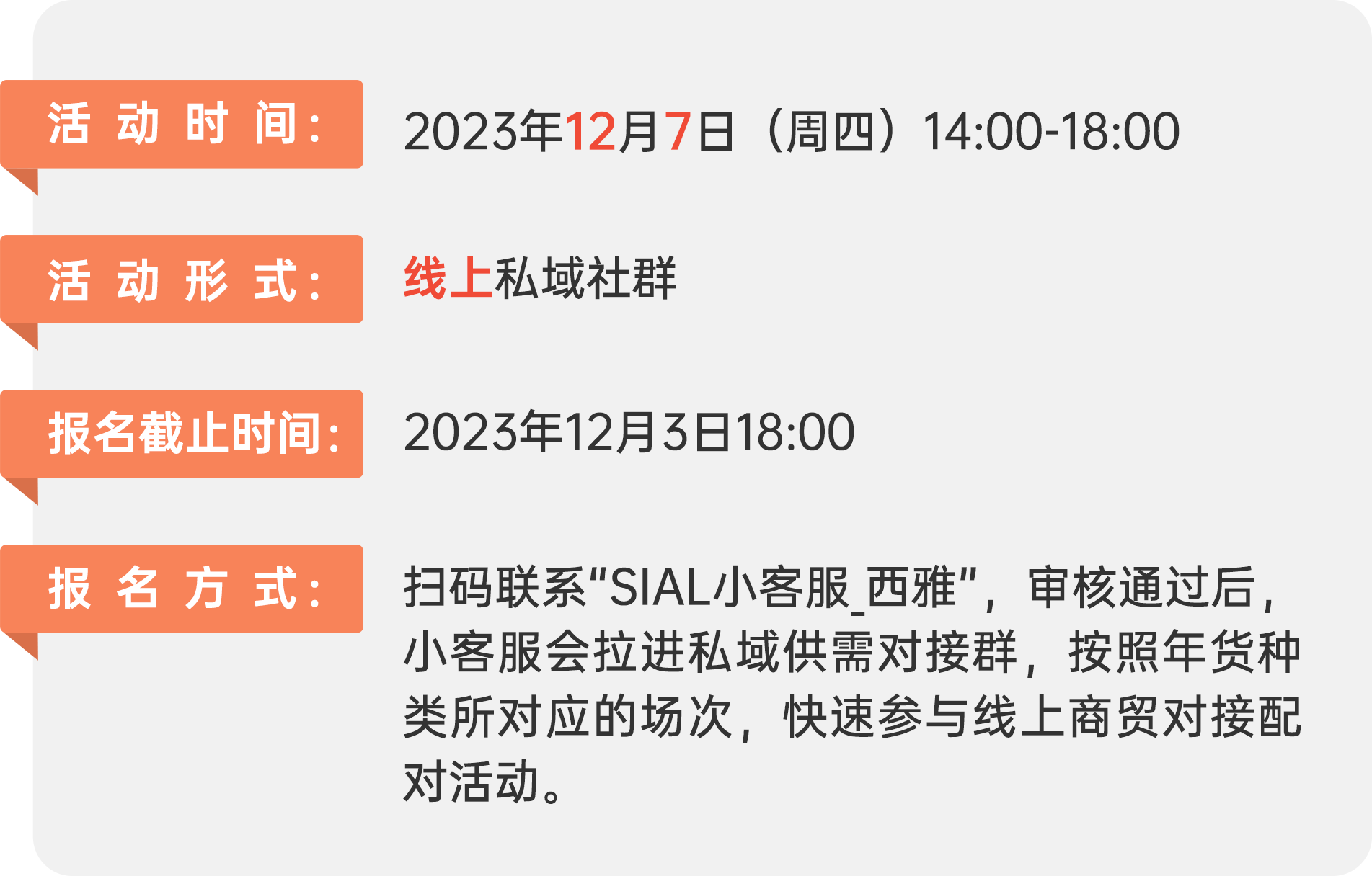 | 為了助力品牌商、經(jīng)銷商、商超等食飲全產(chǎn)業(yè)鏈打好年底最后也是最硬一場(chǎng)“戰(zhàn)役”,SIAL西雅國(guó)際食品展將于12月7日再次發(fā)起線上供需對(duì)接活動(dòng)“SIAL西雅展秋冬食飲采購(gòu)節(jié)”,以私域流量為食飲行業(yè)供需雙方實(shí)現(xiàn)年底完美收官再添助力。 |