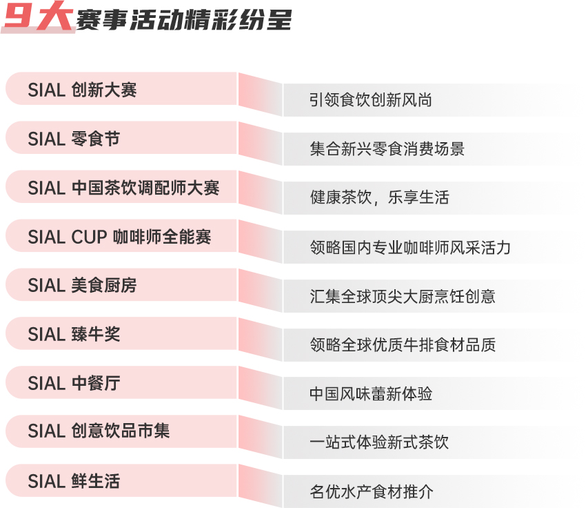 同期還將舉辦以“凝聚全球力量,探索可持續(xù)路徑”為主題的第六屆SIAL世界食品產(chǎn)業(yè)峰會,涵蓋新零售、供應(yīng)鏈、肉類、進(jìn)口食品、飲品、營養(yǎng)健康食品在內(nèi)的主題論壇。現(xiàn)場還有SIAL創(chuàng)新大賽、SIAL CUP咖啡師全能賽、SIAL零食節(jié)、SIAL中國茶飲調(diào)配師大賽等9大同期賽事活動(dòng)輪番登場,打造多元化沉浸式交流互動(dòng)平臺。 |
