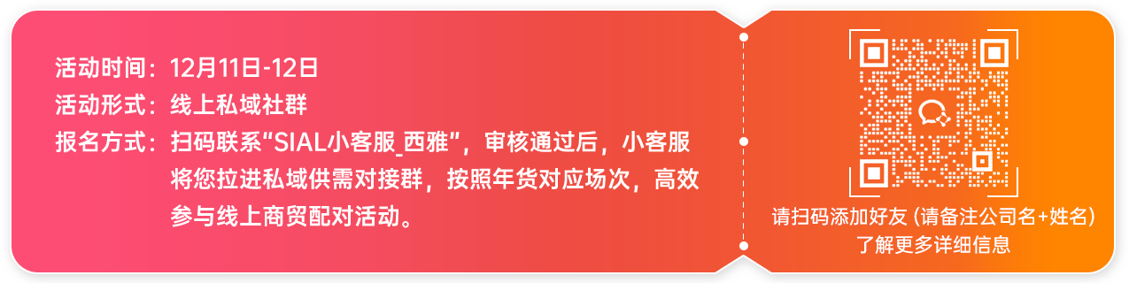 為助力品牌商、經(jīng)銷商、商超等食飲全產(chǎn)業(yè)鏈打好年底最硬的一場(chǎng)“戰(zhàn)役”,SIAL西雅展于12月11日-12日正式啟動(dòng)線上供需對(duì)接活動(dòng)——“SIAL西雅展秋冬食飲采購(gòu)節(jié)”。