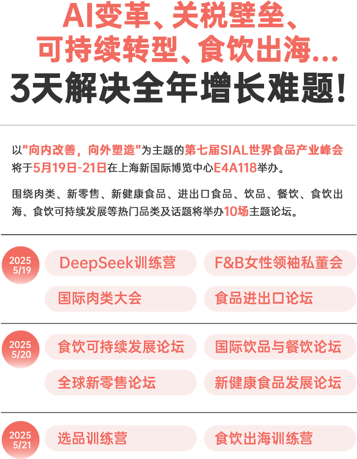 *請注意,本屆峰會門票不包含SIAL西雅展(上海)參觀門票,請您盡快完成展會實名注冊 |