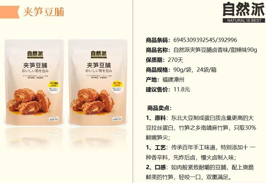 自然派夾筍豆脯,以東北大豆制成的蛋白質含量更高的大豆拉絲蛋白,以及“竹筍之鄉”南靖麻竹筍的30%鮮嫩筍尖為原料,采用百年傳承手工工藝,特別添加十一種香辛料,先炸后鹵,慢火鹵制入味,造就如肉般緊致耐嚼的豆脯與鮮香脆爽的竹筍,讓人輕咬一口,獲得雙重滿足。