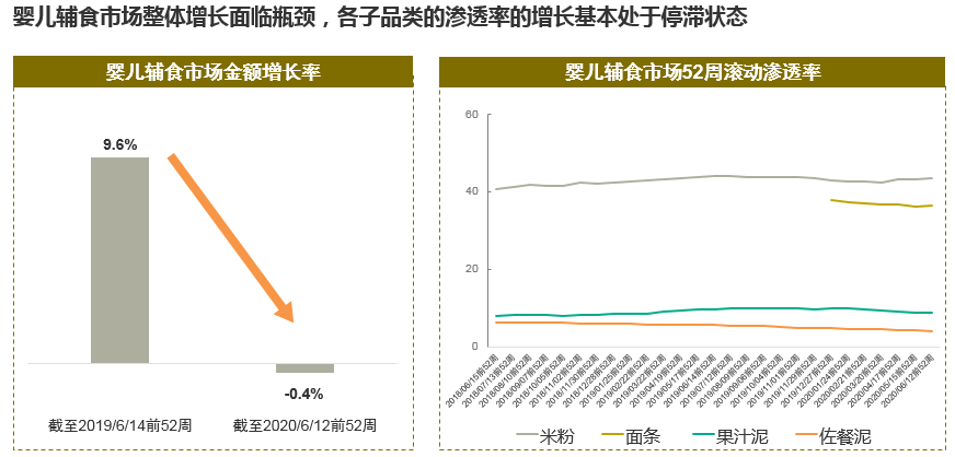 縱覽整體輔食市場,各個子品類增長都并不樂觀,基本處于緩慢增長或是停滯狀態。而從滾動滲透率來看,米粉、面條、果汁泥和佐餐泥在招募市場新消費者上都遇到了瓶頸。