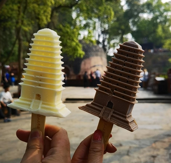 靈寶塔位于樂山大佛景點內,其塔身墩厚挺拔,巍峨靈秀,是不少在樂山大佛景點游玩的游客“打卡”必選地。樂山大佛旅投集團市場部負責人楊定佳說,其實對于這款文創雪糕的開發從去年就已經開始,前期也對全國多個景點進行了市場調查,發現如今游客已經從單純的觀光游,轉變成對更多的全感官特色景點體驗并具有很大的消費潛力。經過慎重考慮,最終選擇了廣受游客喜愛的靈寶塔作為首次推出的文創雪糕的原型,“希望這一步創世既有豐富的樂山大佛景區消費型文創產品的類型,可吃,可看的旅游文創產品讓游客全方位感知大佛景點的文化內涵,打造一張獨特的'舌尖上的文創'名片。”