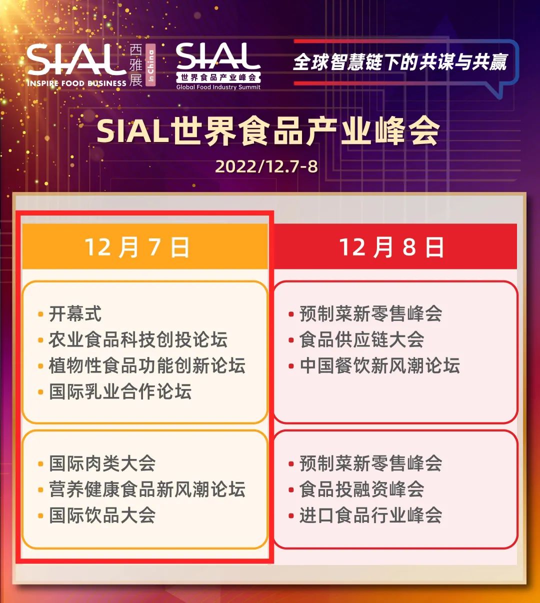 SIAL世界食品產業峰會將于2022年12月7日-8日正式舉辦!峰會將以“全球智慧鏈下的共謀與共贏”為主題舉辦包括預制菜、供應鏈、農業食品科技、乳業、肉類、飲品、食品投融資、營養健康食品、中餐、植物性食品、進口食品在內的11場主題論壇。