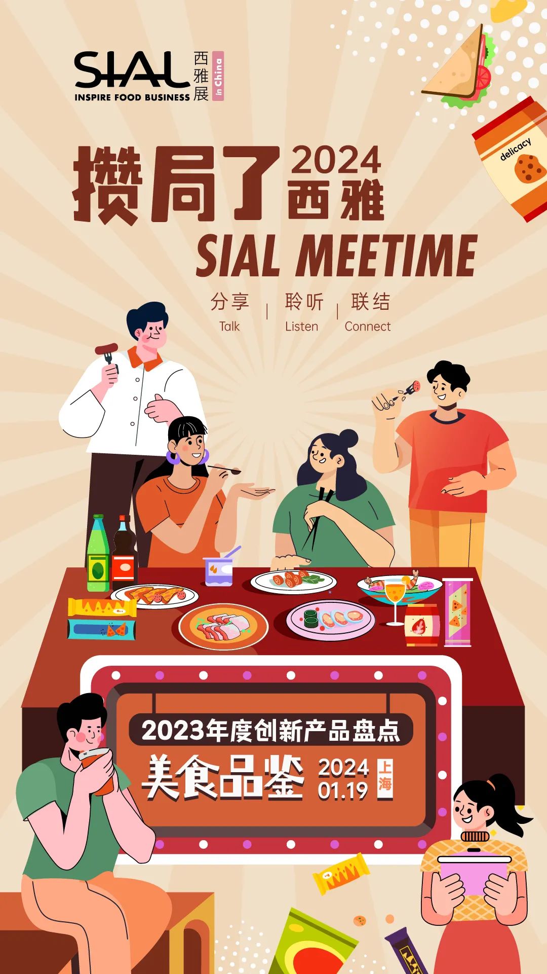 本期<SIAL Meetime 攢局了!西雅>線下沙龍活動將邀請食飲行業生產商、零售商、行業專家等,從各自不同的角度進行“2023年度創新產品大盤點”,分析熱門品類及產品發展特點,洞悉前沿食飲創新趨勢,為食飲企業在2024年開拓商機帶來有效思路!屆時,現場還將準備多款創新產品供各位品嘗,為大家未來的產品研發創新帶來新靈感!