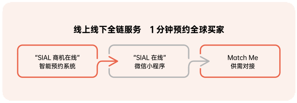 SIAL 西雅展通過(guò)一系列精準(zhǔn)高效的商貿(mào)服務(wù),幫助展商快速找到目標(biāo)買家,推動(dòng)業(yè)務(wù)快速發(fā)展,如通過(guò)SIAL在線小程序全鏈服務(wù),展商只需1分鐘即可預(yù)約全球買家,快速建立商貿(mào)聯(lián)系。